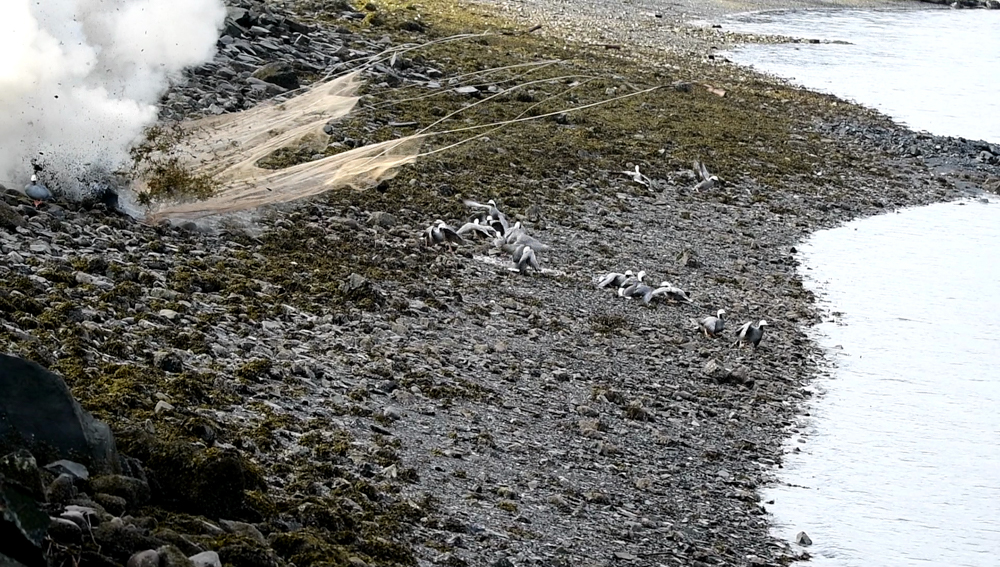 In 2019, the Alaska Department of Fish and Game established a program to track the survival of Emperor Geese in their wintering habitats. With trap locations identified, successful captures depended on a mix of tidal fluctuations, wind variability, and the birds’ awareness of trap sites. Early efforts with repurposed goose decoys painted as Emperor Geese didn’t quite achieve the desired success.