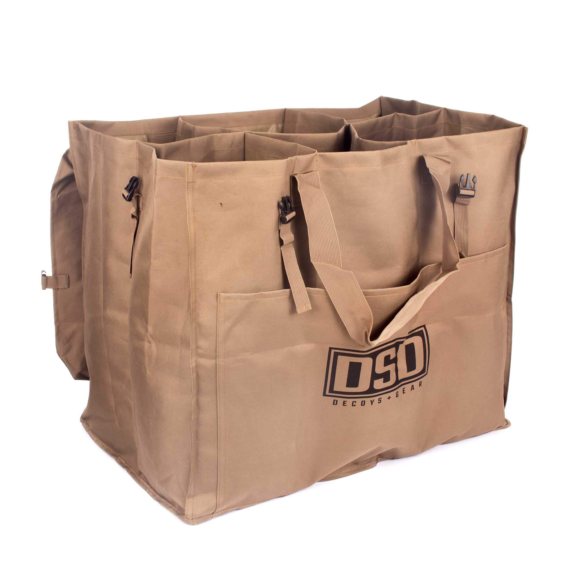 Made from 1000 Denier Cordura the DSD 6-Slot Giant Bags are the perfect durable slotted bag to keep your decoys clean and organized. These premium decoy bags also come with a pouch on the side for easy storage of stakes and other accessories. The top flop lid connects to the main bag with 4 buckles to keep your decoys protected from wear. Handles on each side also make the bag easy to carry.